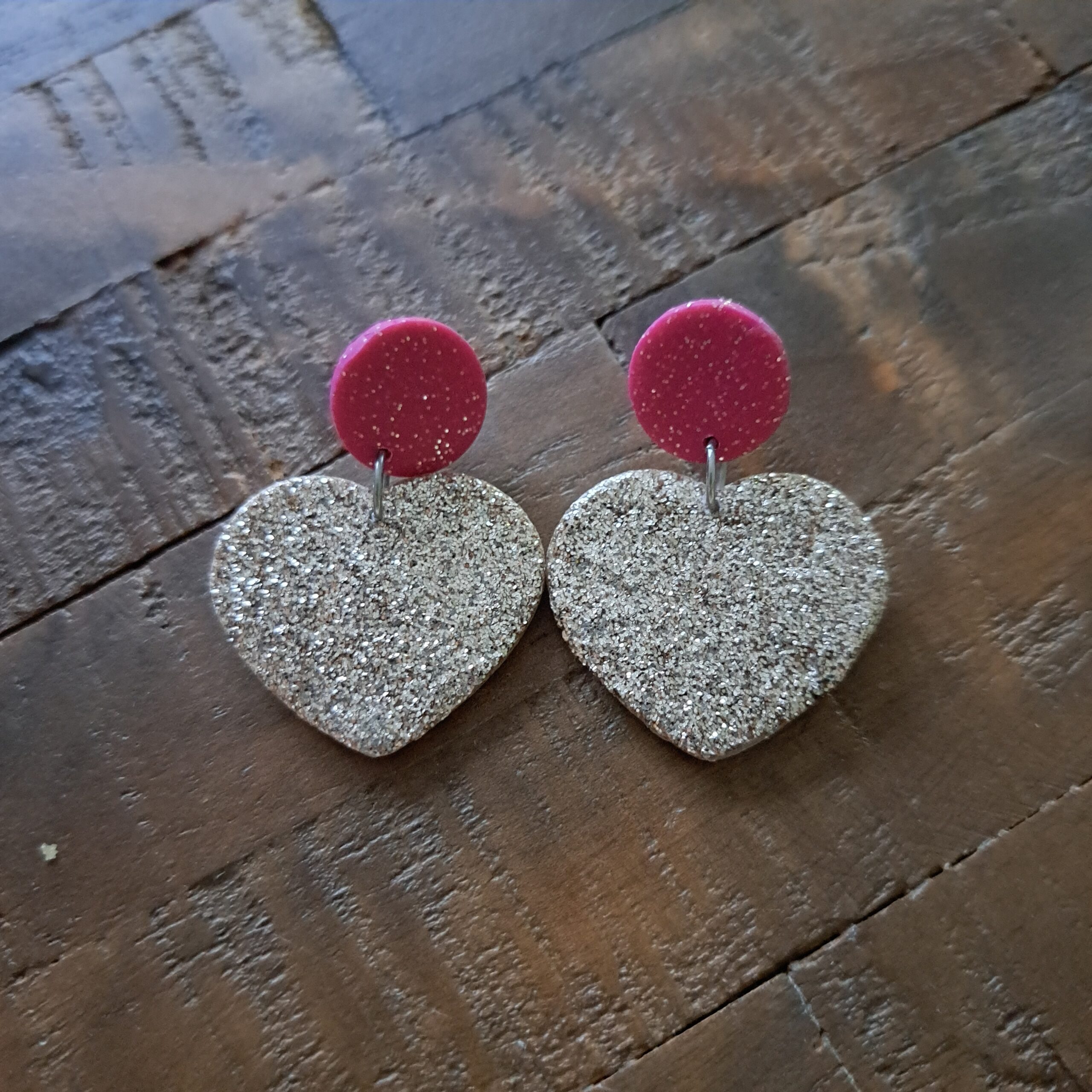 Les pièces principales de ces boucles d’oreilles artisanales sont en pâte polymère, coeur paillettes, rouge, résine.